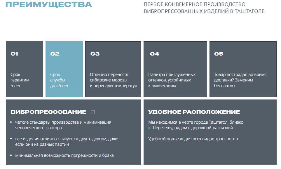 Мы запустили конвейерное производство и разработали рецептуру, обеспечивающую устойчивость нашей продукции к экстремальным климатическим условиям. Это позволяет ей сохранять свойства и внешний вид на протяжении всего срока службы.