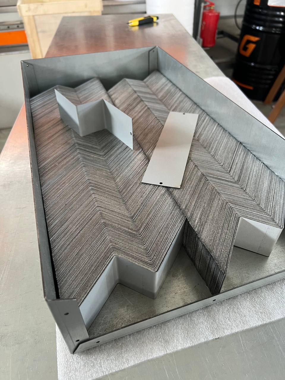 -Имеется лазерная установка, для раскроя сложных элементов (в том числе перфорации и рисунков на стали).