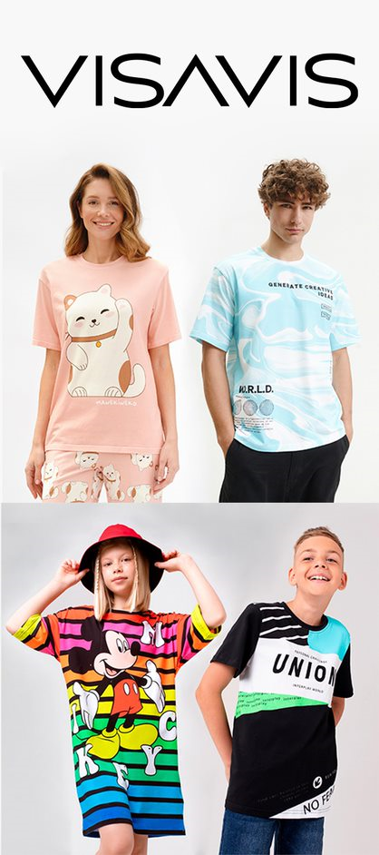 Мы компания VISAVIS — российский производитель одежды под собственными торговыми марками VIS-A-VIS для женщин, TORRO для мужчин и JUST PLAY для детей. Контролируем полный цикл производства готового изделия от выбора ткани и цифровой печати на ткани до пошива товара и его упаковки. Постоянно пополняем ассортимент, 10 новых дизайнов и принтов каждые две недели.